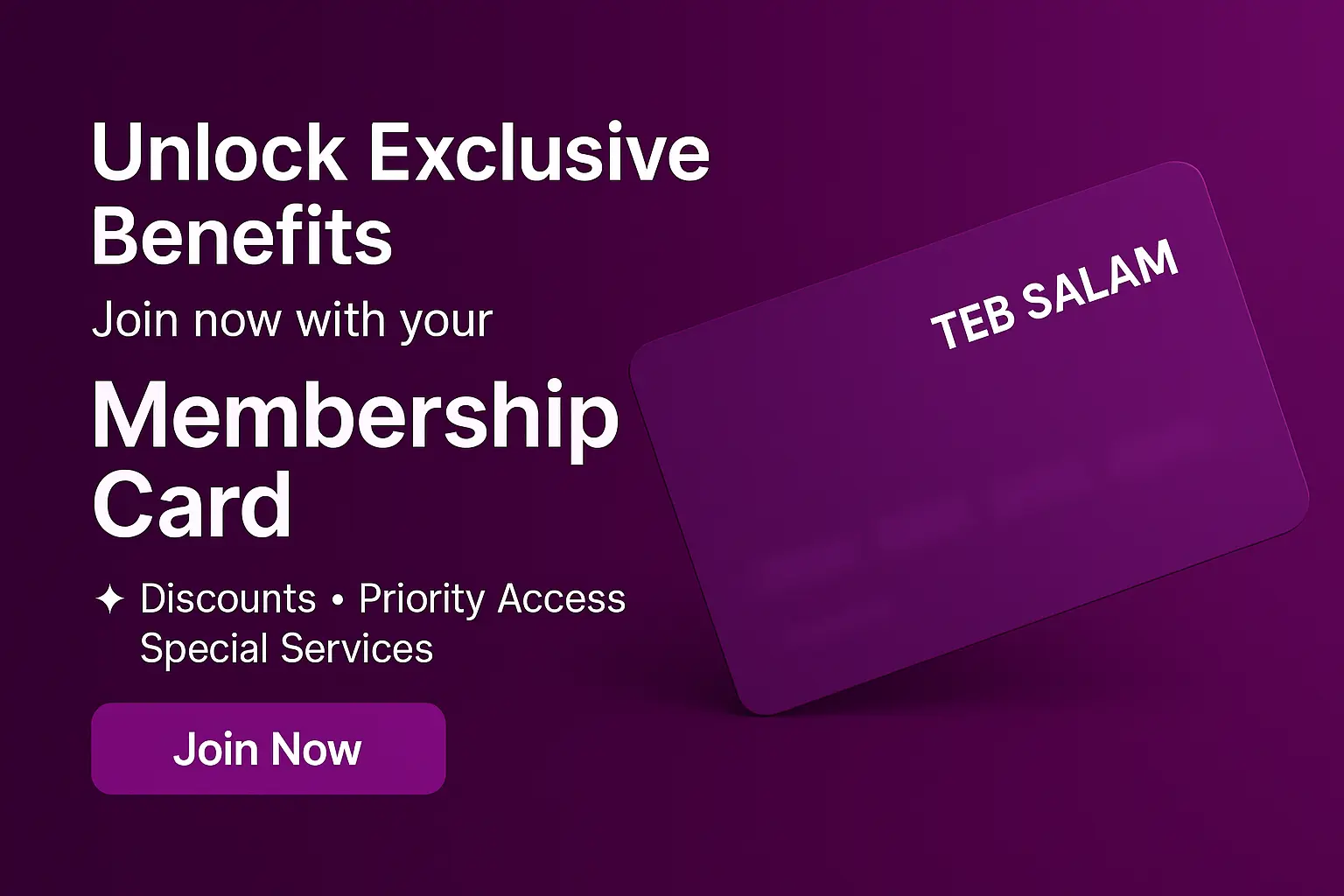 Join the ranks of our loyal customers and enjoy the unique benefits of becoming a Teb Salam loyalty cardholder. This isn’t just a simple card; it’s your key to a world of discounts, exclusive services, and special offers.
